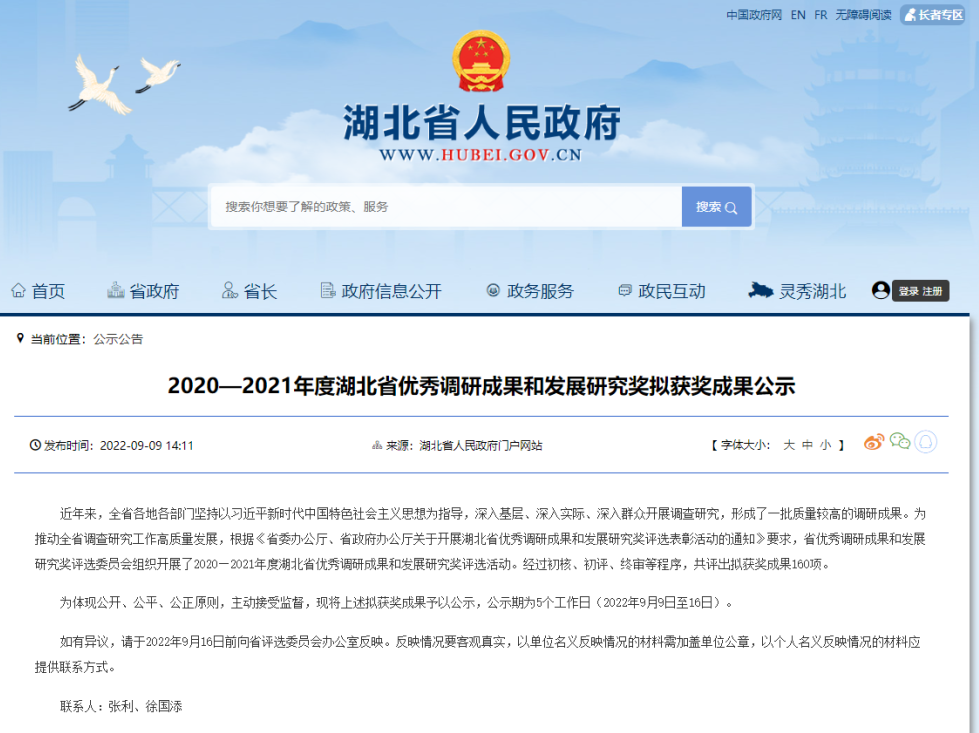 近日,省委、省政府对“2020-2021年度湖北省优秀调研成果奖和发展研究奖”予以通报表彰,校长郑军教授带领调研团队撰写的《激发市场主体活力研究报告》获“湖北省优秀调研成果奖”一等奖。