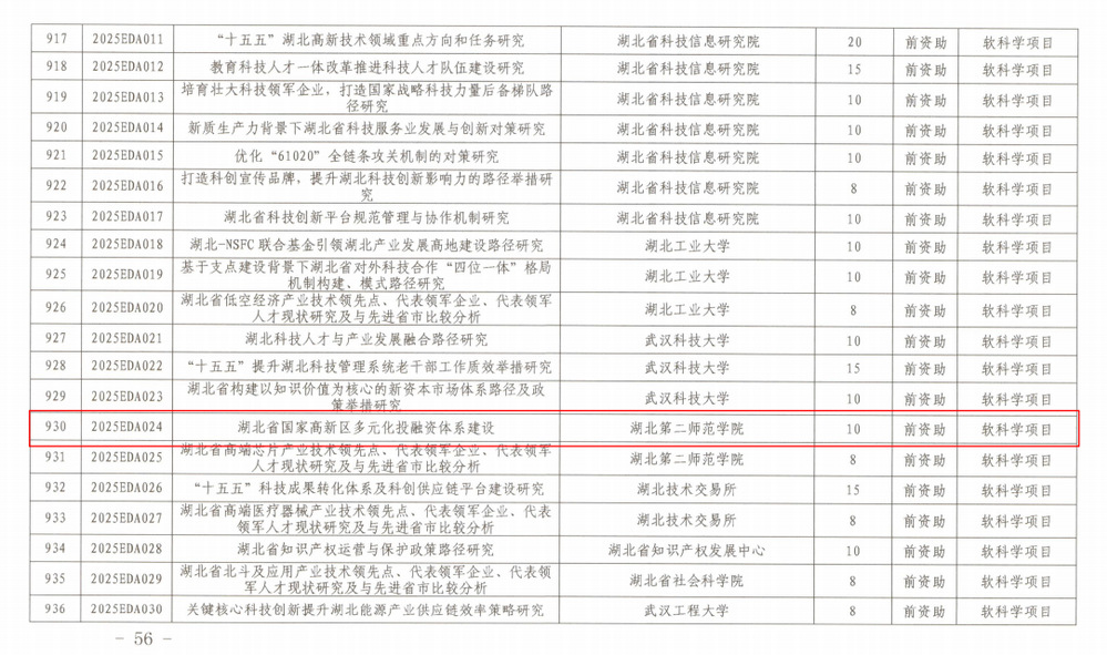 近日,中心刘旺霞教授主持申报的课题《湖北省国家高新区多元化投融资体系建设研究》(项目编号:2025EDA024),成功获批2025年度湖北省科技计划软科学研究重点项目。该项目聚焦我省国家高新区创新发展的核心金融支撑问题,旨在为构建市场化、多元化的科技投融资服务体系提供关键决策参考。