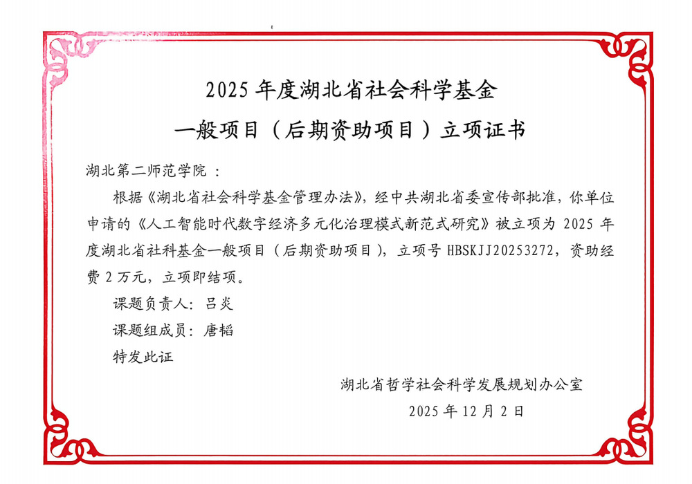 近日,湖北省哲学社会科学发展规划办公室公布了2025年度湖北省社会科学基金项目立项名单,中心副主任吕炎副教授申报的学术专著成果《人工智能时代数字经济多元化治理模式新范式研究》,成功入选2025年度湖北省社会科学基金后期资助项目。