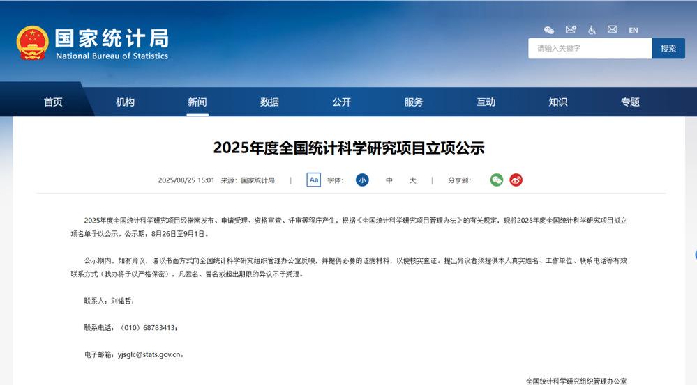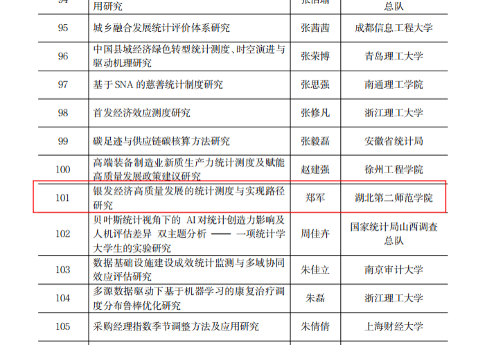 近日,国家统计局公布了2025年度全国统计科学研究项目立项名单,由中心主任郑军教授作为项目负责人申报的课题《银发经济高质量发展的统计测度与实现路径研究》(项目编号:2025LY101),成功获得立项。