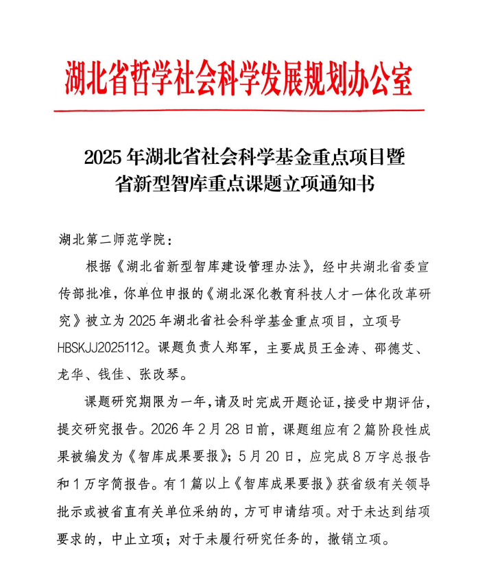 近日,从湖北省哲学社会科学发展规划办公室传来喜讯,中心主任郑军教授主持申报的研究项目《湖北深化教育科技人才一体化改革研究》(项目编号:HBSKJJ2025112),成功获批为2025年度湖北省社会科学基金重点项目。